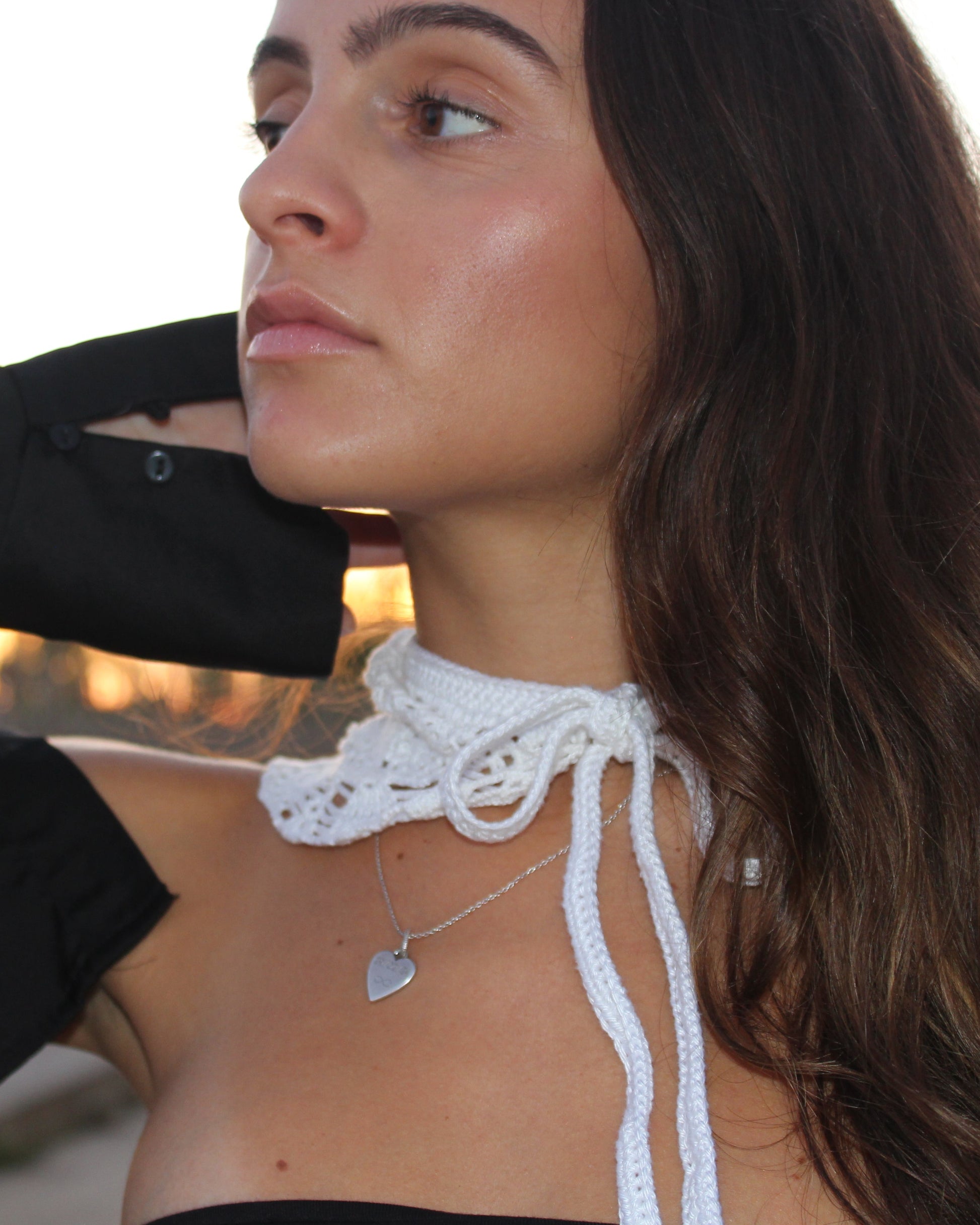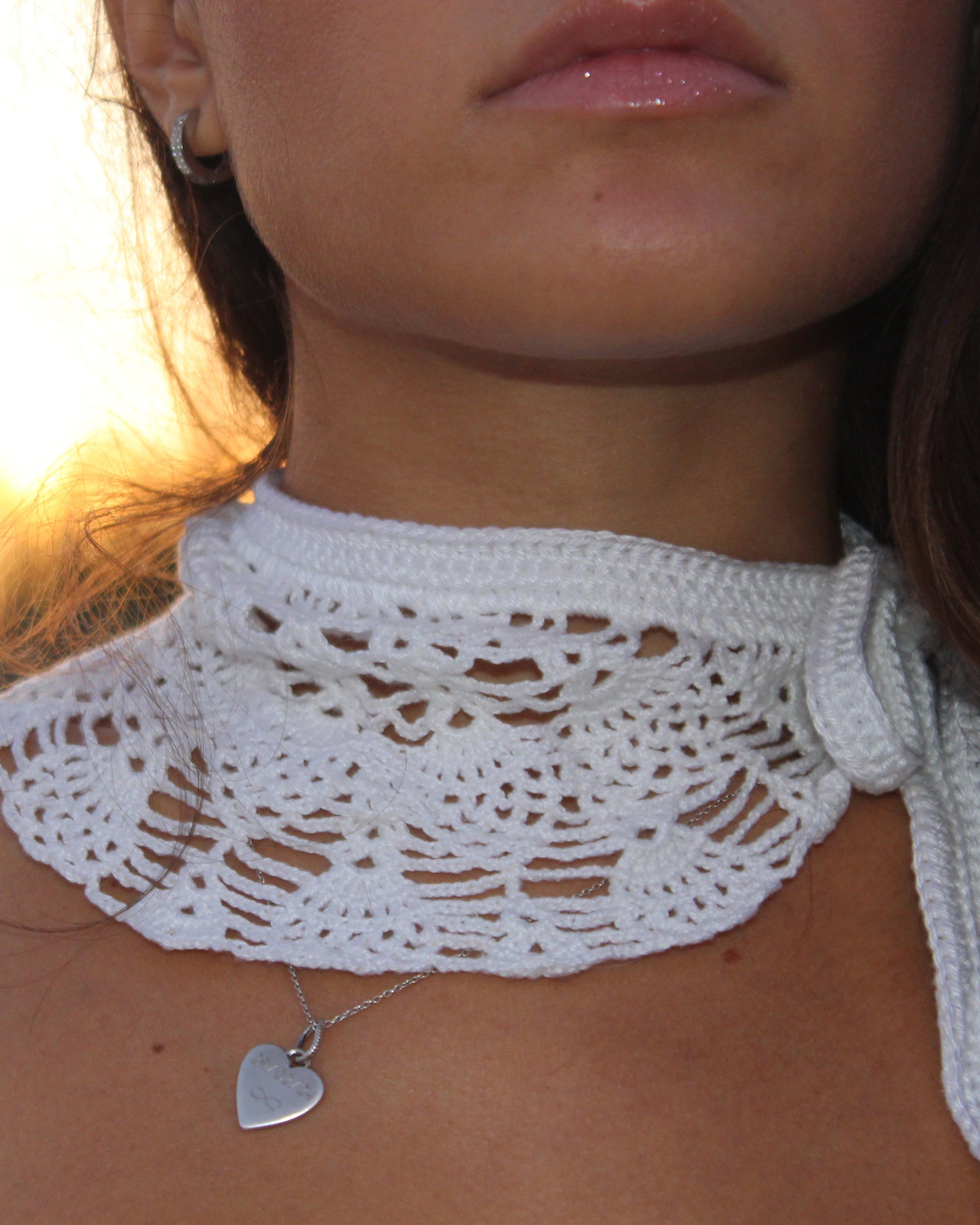 Choker realizzato all’uncinetto attraverso l’up-cycling di un centrino vintage. Dotato di laccetto laterale per regolare la chiusura.