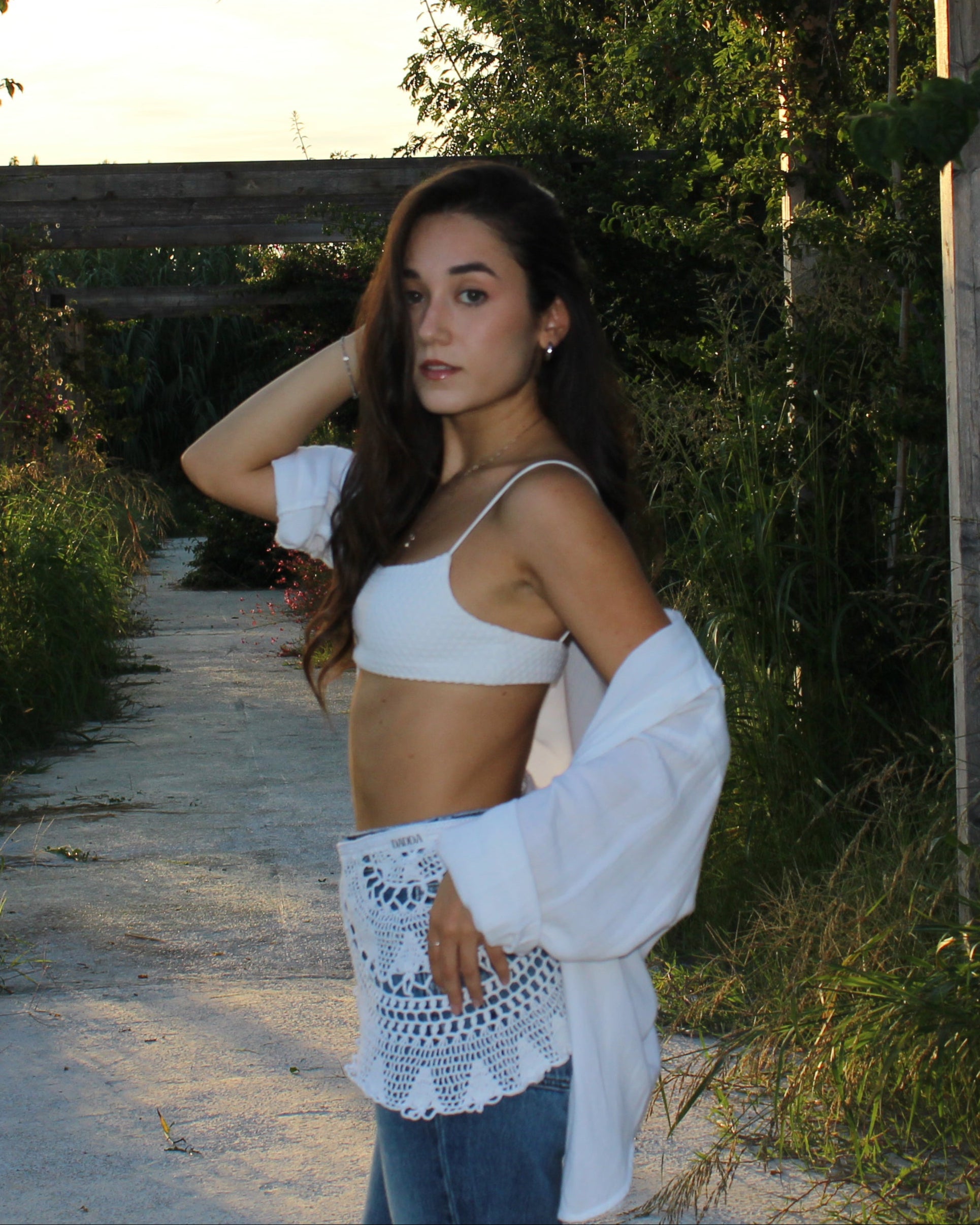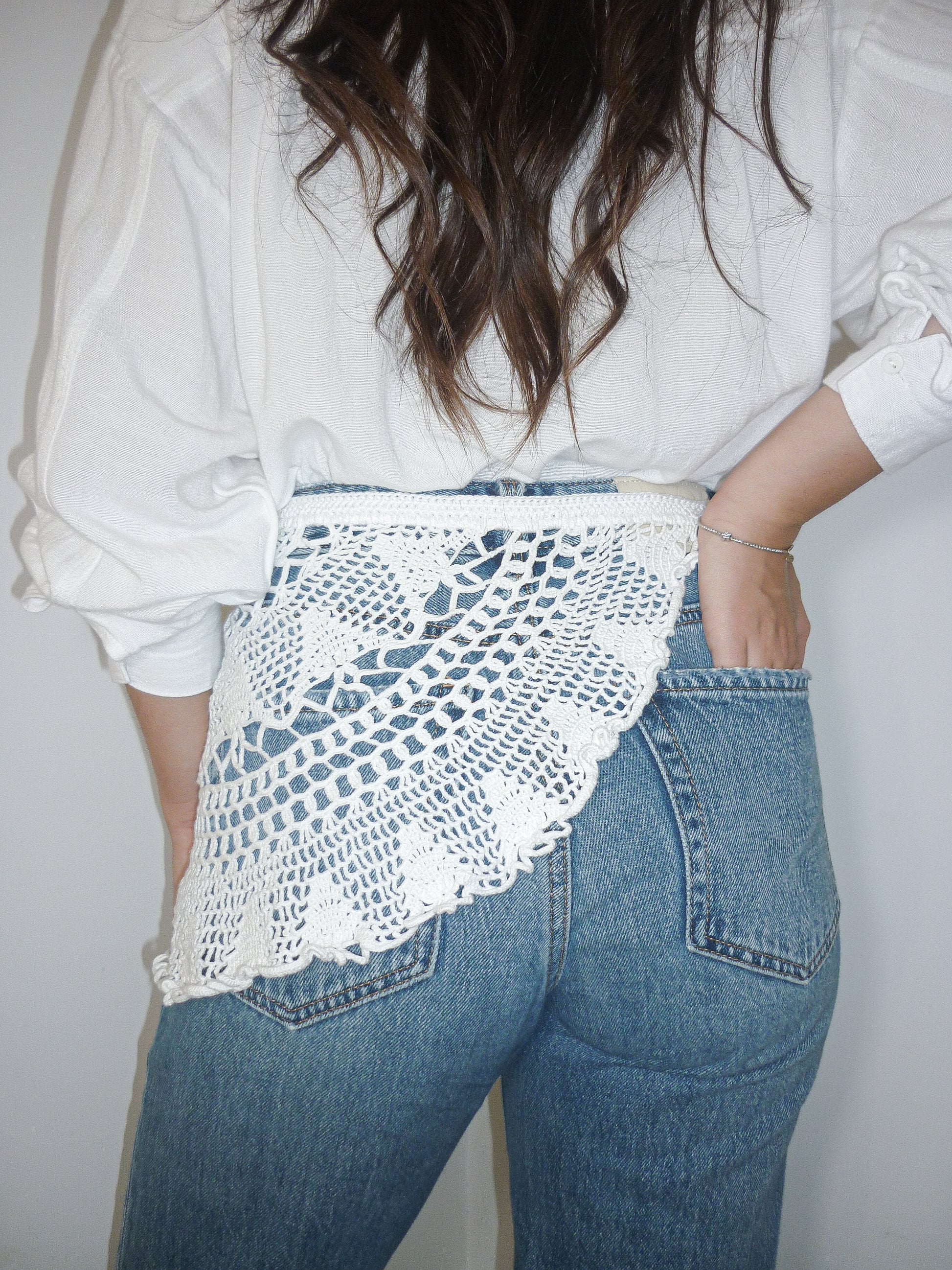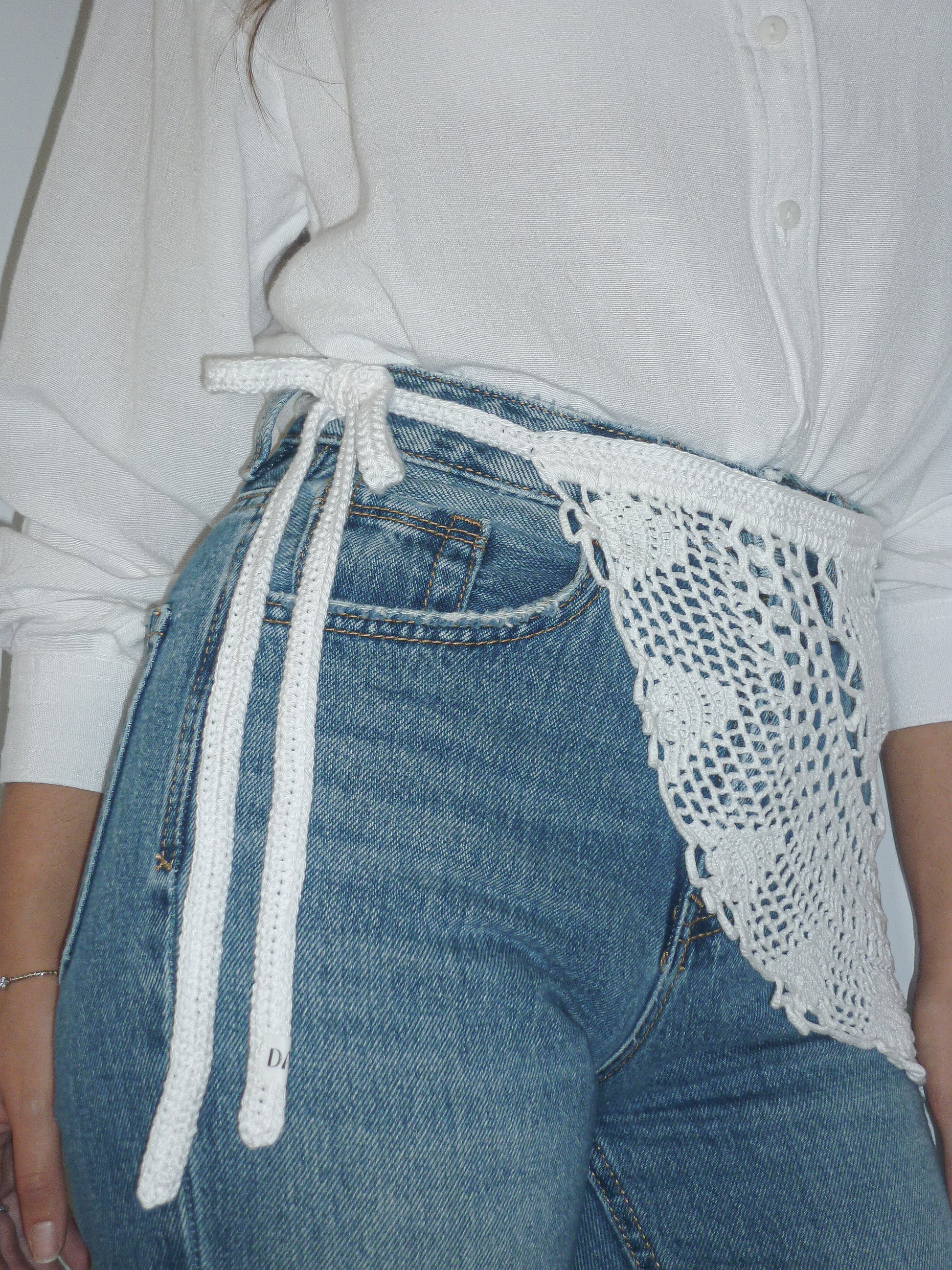 Cintura realizzata all’uncinetto attraverso l’up-cycling di un centrino vintage. Dotata di laccetto laterale per regolare la chiusura.