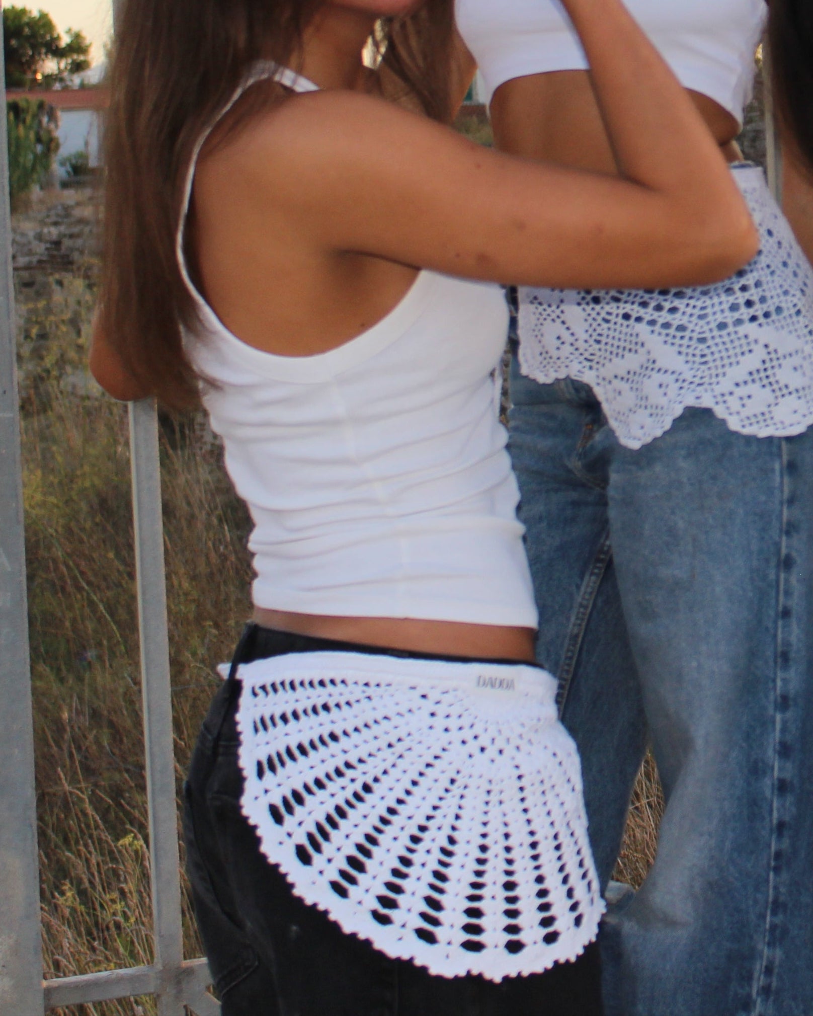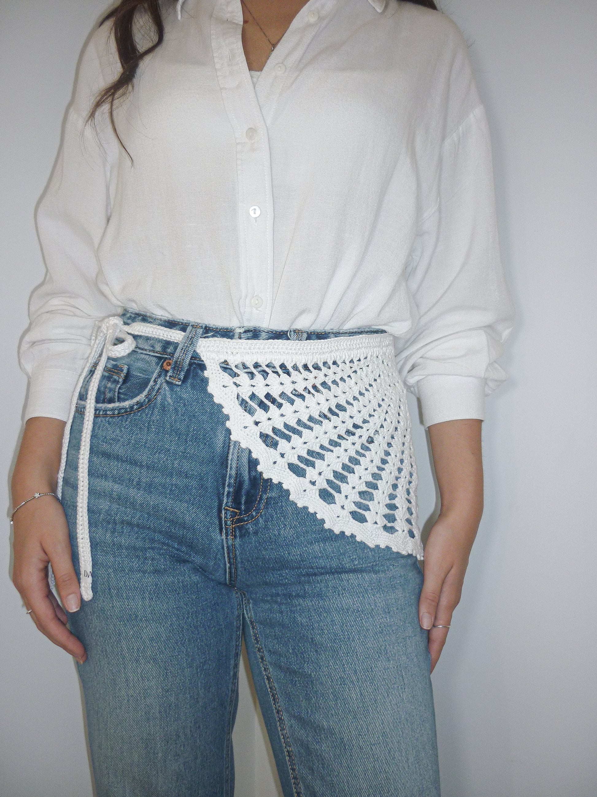 Cintura realizzata all’uncinetto attraverso l’up-cycling di un centrino vintage. Dotata di laccetto laterale per regolare la chiusura.