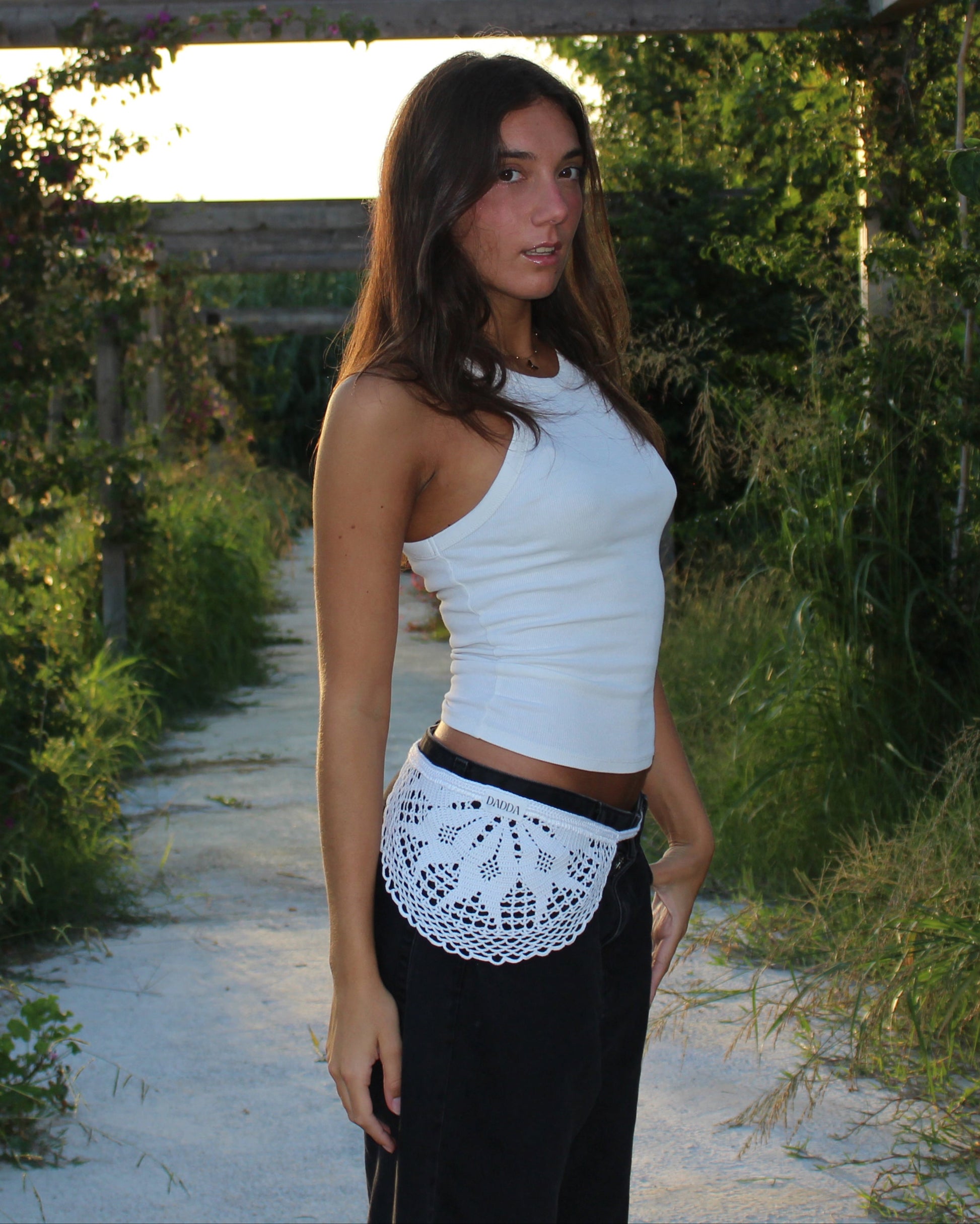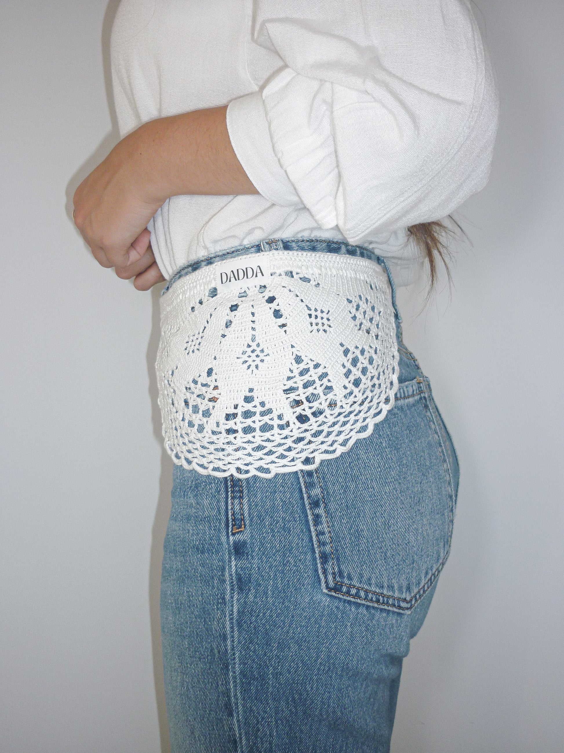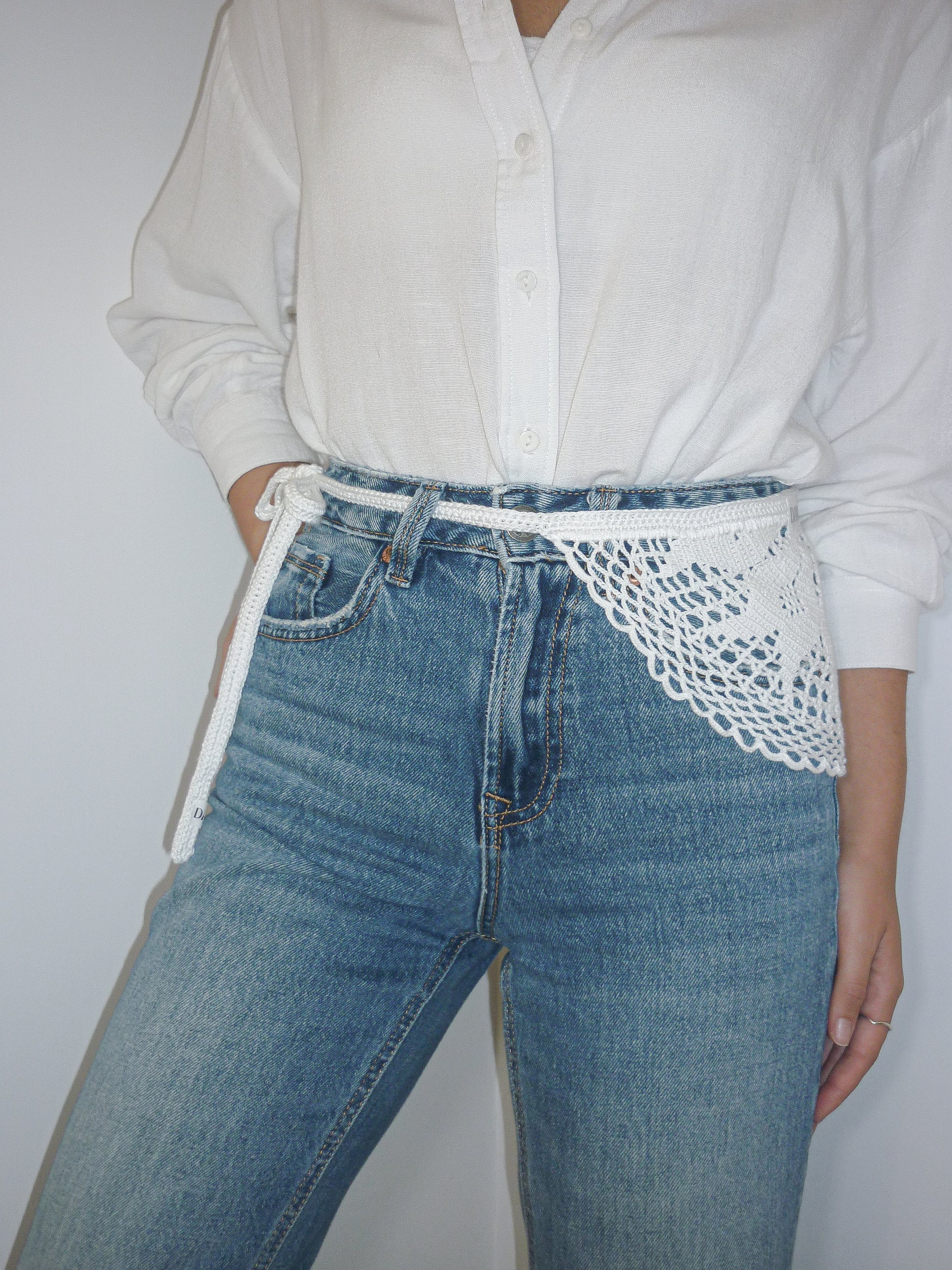 Cintura realizzata all’uncinetto attraverso l’up-cycling di un centrino vintage. Dotata di laccetto laterale per regolare la chiusura.